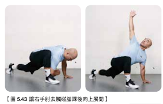 在二本書上都有提到髖外展動態伸展(蜘蛛人胸椎轉體),常見的版本是後腳膝蓋離地,而退階的版本是可以讓「後腳膝蓋」點地,而若要針對髖關節旋轉的活動及控制再多一點,可以進階到「弓前步大腿後側伸展+胸椎旋轉」,除了伸展大腿後側外,它會更挑戰身體的穩定度及控制。>