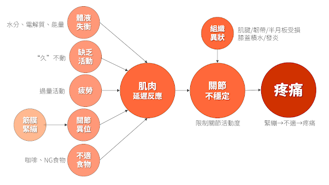 肌筋膜緊繃會導致關節錯位,導致肌肉延遲反應,引起關節不穩定,最後產生疼痛。而為什麼日常工作及飲食會導致筋膜緊繃(缺水)呢?